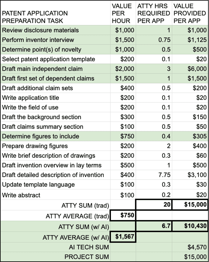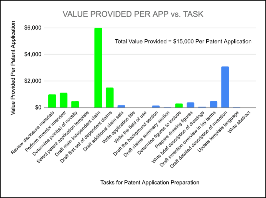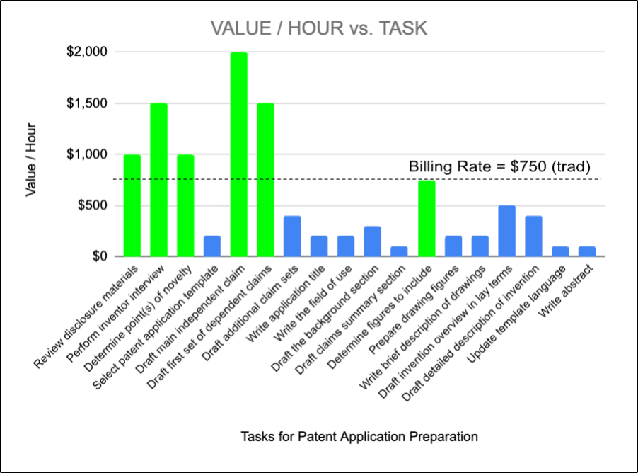 Preparing a patent application involves a series of discrete tasks. These range from drafting claims to preparing drawings, each requiring an investment of time and resources. Figure 1 illustrates how patent preparation tasks range widely in the amount of “actual value” they offer clients based on the level of skill and mental effort required (scaled for a billing rate of $750). The tasks with values at or above the hourly billing rate have been highlighted in green.